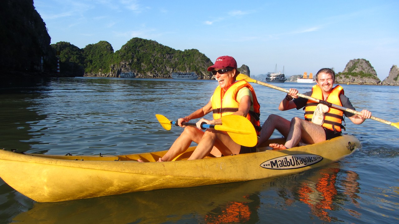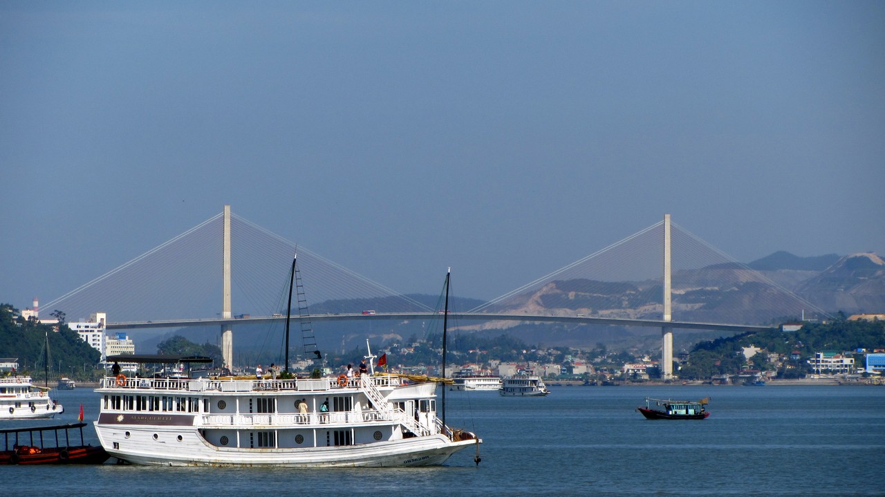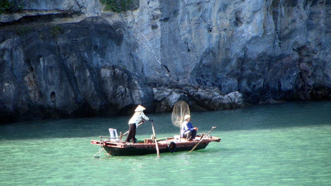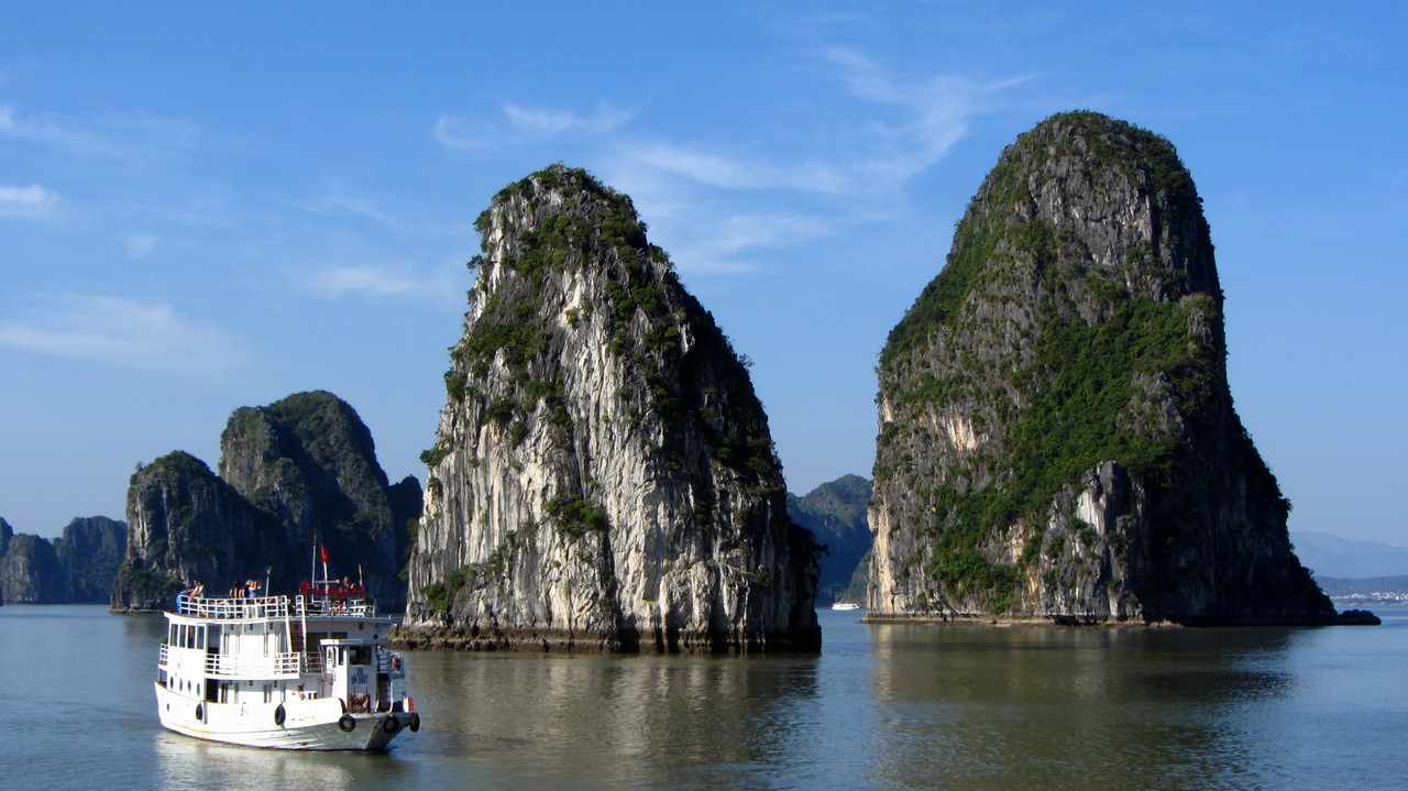 Kurz nach acht wurde ich von Alova Gold abgeholt und es ging in einem Minibus in Richtung Osten. Die ganze Fahrt dauerte vier Stunden, mit einem kurzen Stopp auf halber Strecke bei einem riesigen Fabrikladen. Im Hafen endlich angekommen, sind wir auf ein kleines Beiboot und dann auf unser großes Schiff gegangen. Wir sind 15 Leute (aus Deutschland, Australien, USA, Canada und Russland) und nun zwei Tage in der Bucht, die Unesco Weltnaturerbe und auch eines der 7 Weltnaturwunder ist, zusammen unterwegs.