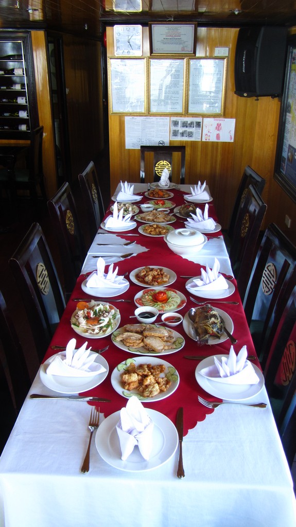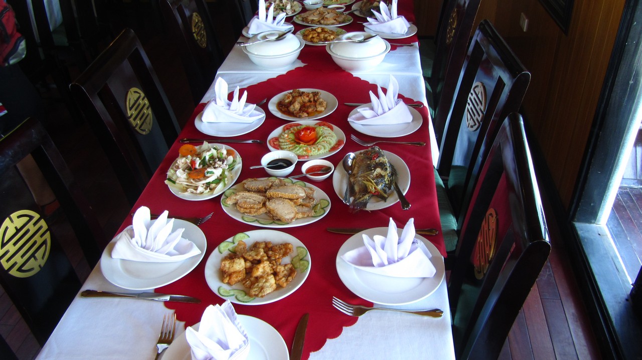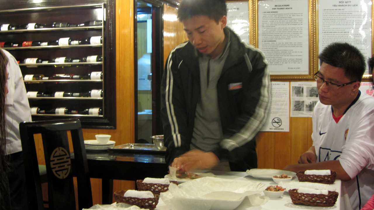 Später sind wir wieder zurück zum Schiff. Der nächste Programmpunkt war: Cooking Class. Es wurde uns gezeigt wie man eine typisch vietnamesische Frühlingsrolle macht. Danach gab es Cocktail happy Hour und etwas später Abendessen. Das war, ebenso wie das Mittagessen, sehr gut. Es gab Krabben, Garnelen, Fisch, Tofu, Fleisch, Gemüse, Obst… Witzig übrigens: hier schwirren immer Frauen in kleinen Booten um die Schiffe, die voll gepackt sind mit Getränken und Knabberzeugs “cheap, cheap”. Also satt wird man hier immer. Nach dem Abendessen konnte man Angeln oder eben die Zeit an der Bar verbringen. Draußen war es erstaunlich frisch. Ist man gar nicht mehr gewohnt.