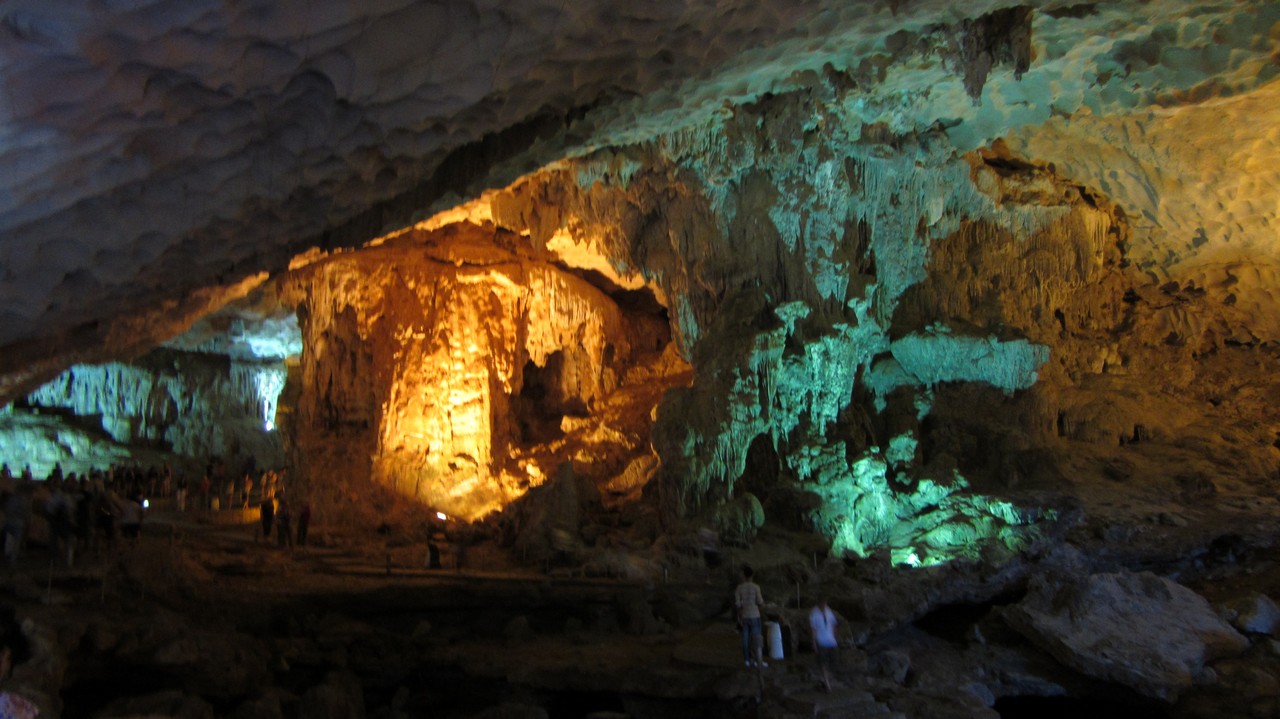 Um halb acht gab es bereits Frühstück und anschließend wurden wir zu einer nahen Insel und der Sun Sot Höhle gefahren. Die “Überrraschungs”-Höhle liegt gute 150 Stufen höher im Berg und ist eine Tropfsteinhöhle. Sie ist ganz nett, allerdings wurde die komplette Decke mit Beton zugegossen. Schade!