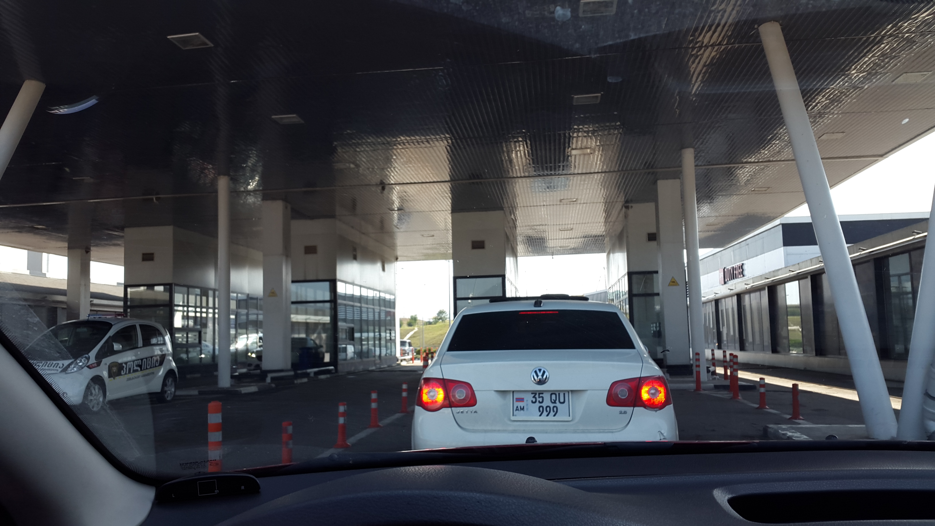 Also wieder zurück zur Grenze und diesmal klappte die Ausreise problemlos. Ein paar hundert Meter weiter kam dann die Einreise nach Armenien. Dort wieder alle Dokumente abgeben, Beifahrer raus und warten. Wieder war alles ok nur sollte ich nun an der Seite in ein Gebäude gehen und ein Dokument stempeln lassen. Es gab 4 Schalter, 3 Männer die nur am Handy spielten und eine Frau die alles bearbeitete. Davor ein wüster Haufen mit drängelnden Leuten. Schließlich war ich dran und bekam das Dokument. Sogar auf deutsch erklärte sie mir, dass ich das nicht verlieren darf, ansonsten kann ich den Wagen nicht wieder ausführen.