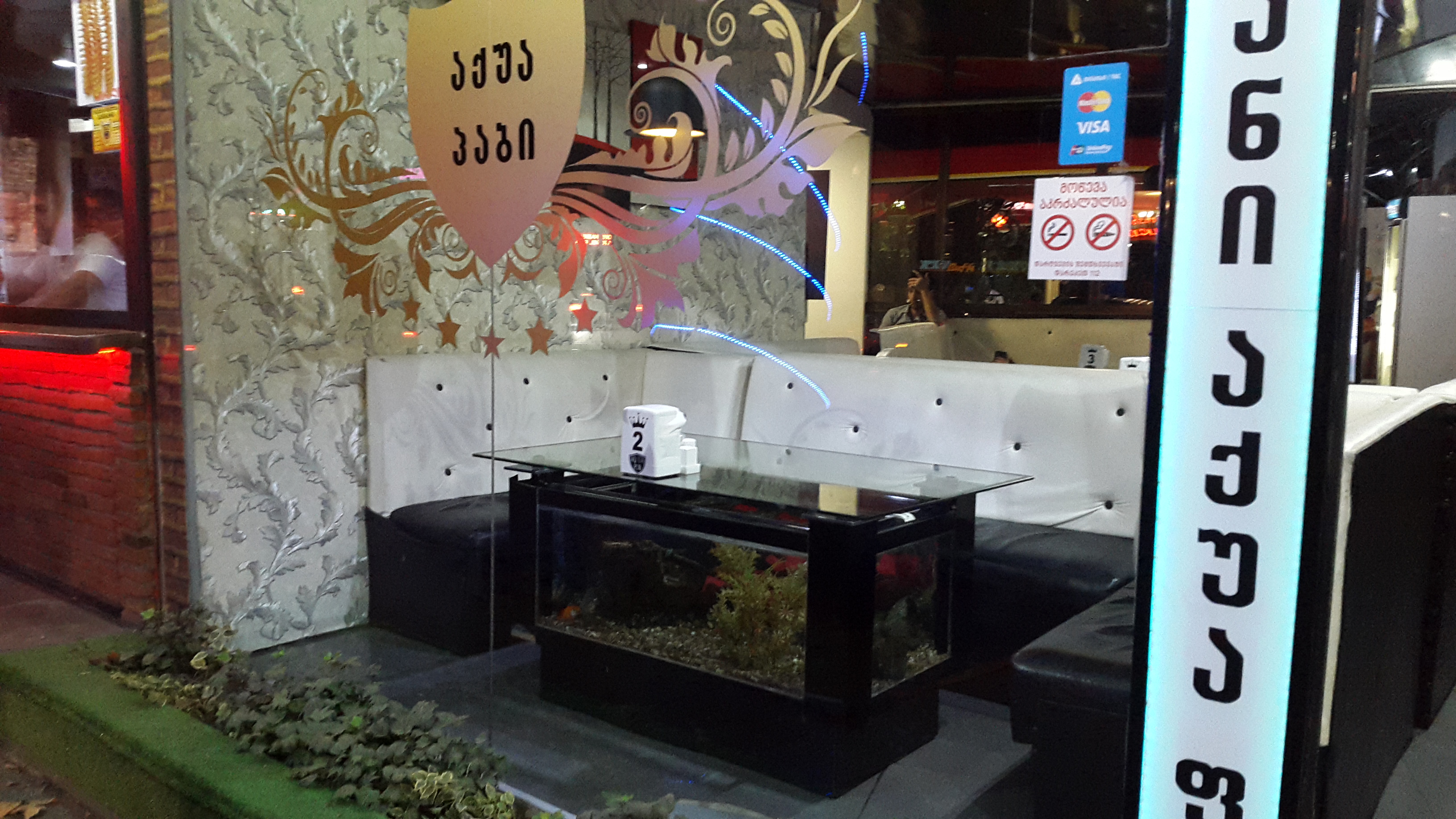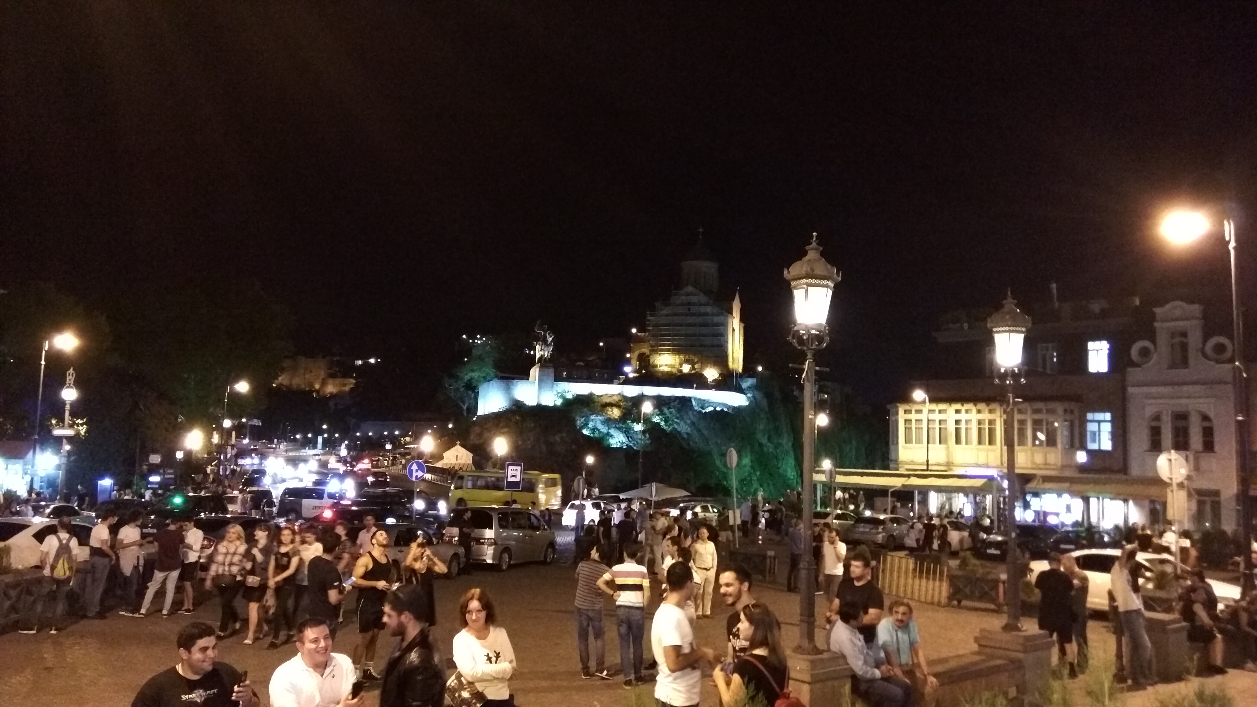 Wieder in Tiflis schauten wir uns dann mal die Umgebung an. Besonders die am Abend toll beleuchtete Friedensbrücke ist ein Highlight. Man könnte auch mit der Seilbahn zur Festung Narikala hochfahren, aber das haben wir auf den nächsten Tag verschoben. Nach einem kleinen Rundgang aßen wir im Smart Pub zu Abend. Ein kleines Restaurant mit mehreren unterirdischen Etagen. Das Essen war gut und günstig. Es gab diverse lokale Spezialitäten wie zum Beispiel Khinkali. Das sind kleine gefüllte Teigtaschen.