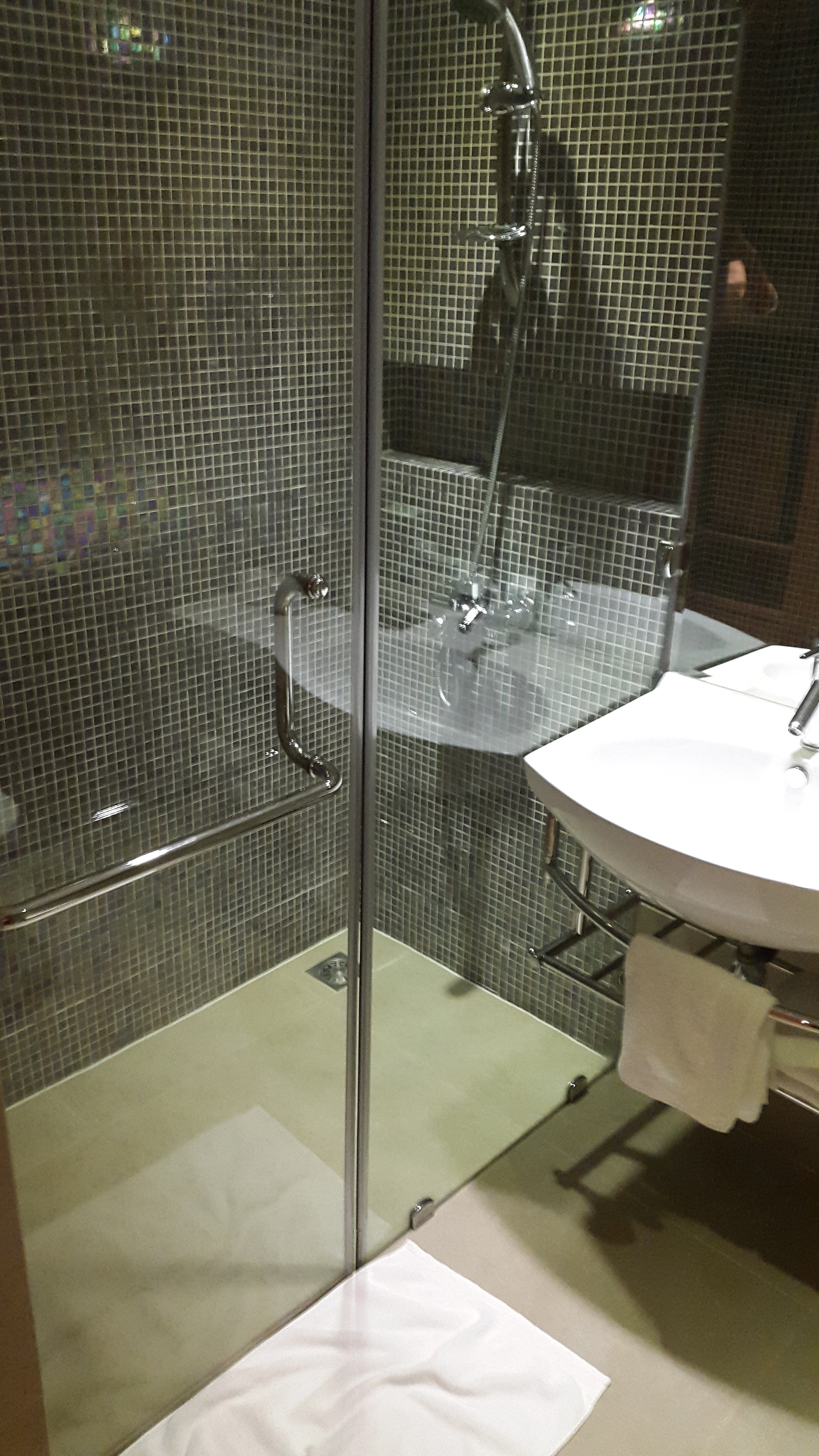 Das Bad ist für den mittleren Osten ausgesprochen schön und handwerklich gut gemacht. Habe ich bisher hier selbst in Luxushotels nicht gesehen. Die Pflegeprodukte riechen gut und es fehlt an nichts. Gut gefallen hat mir die große Dusche.