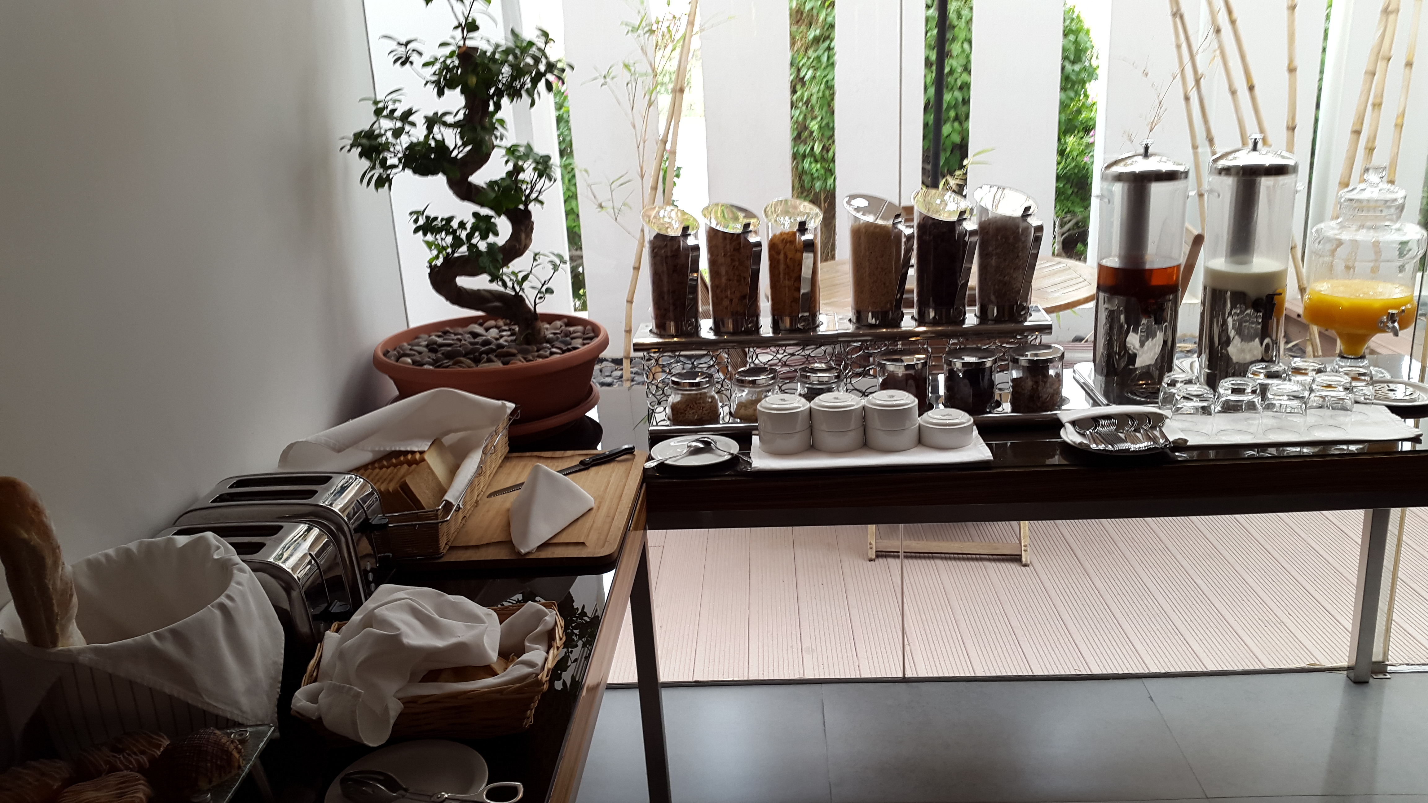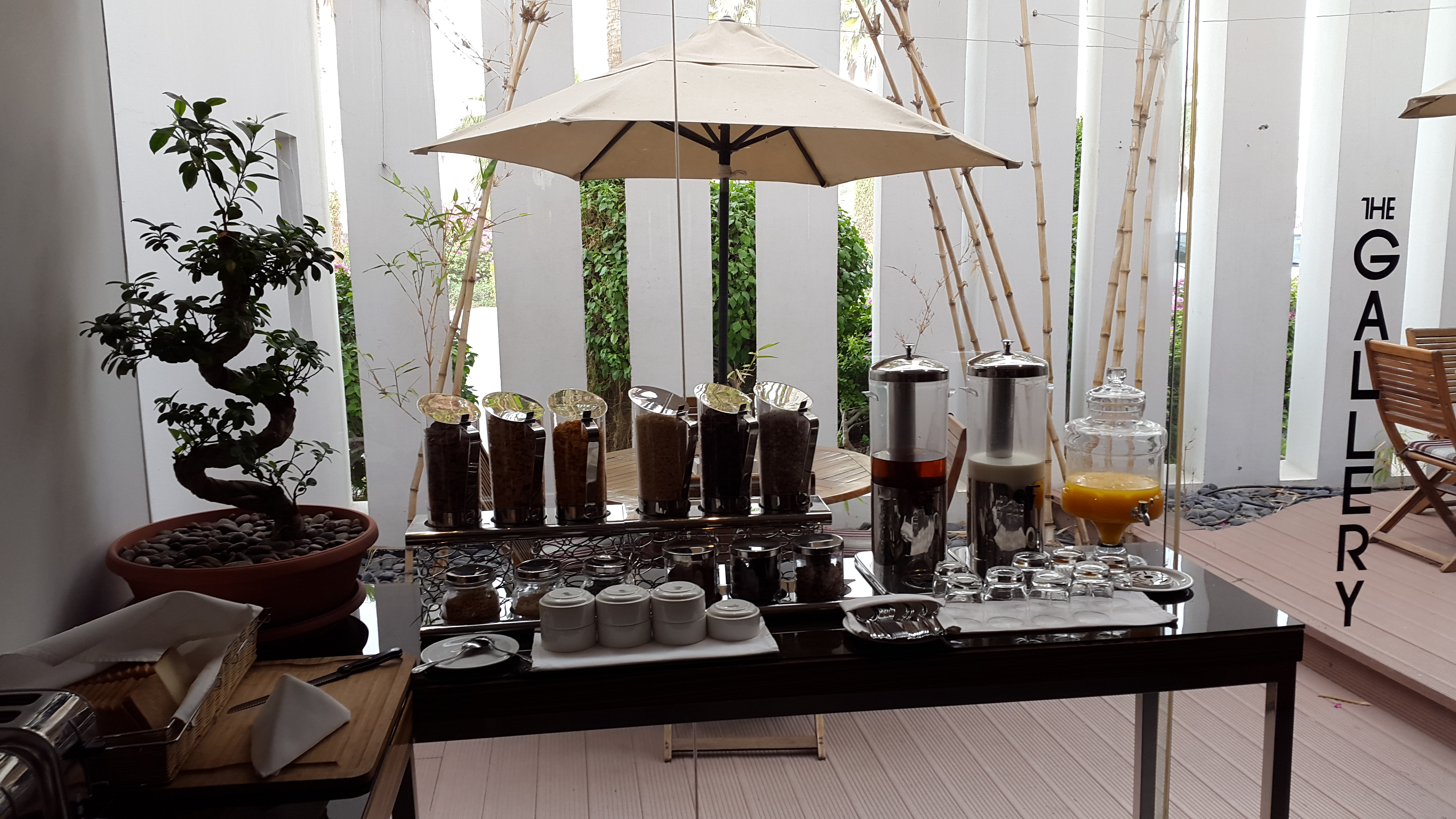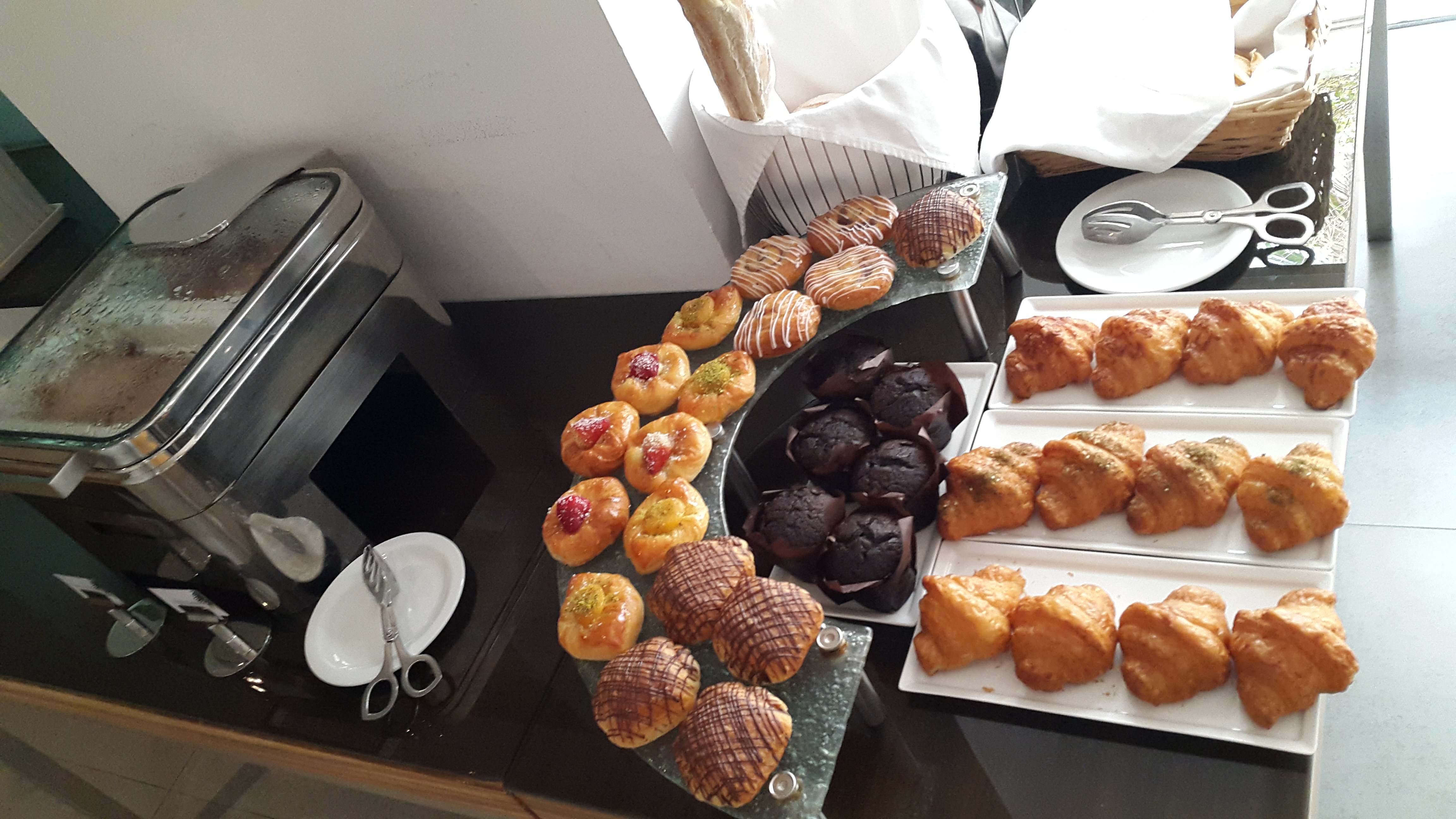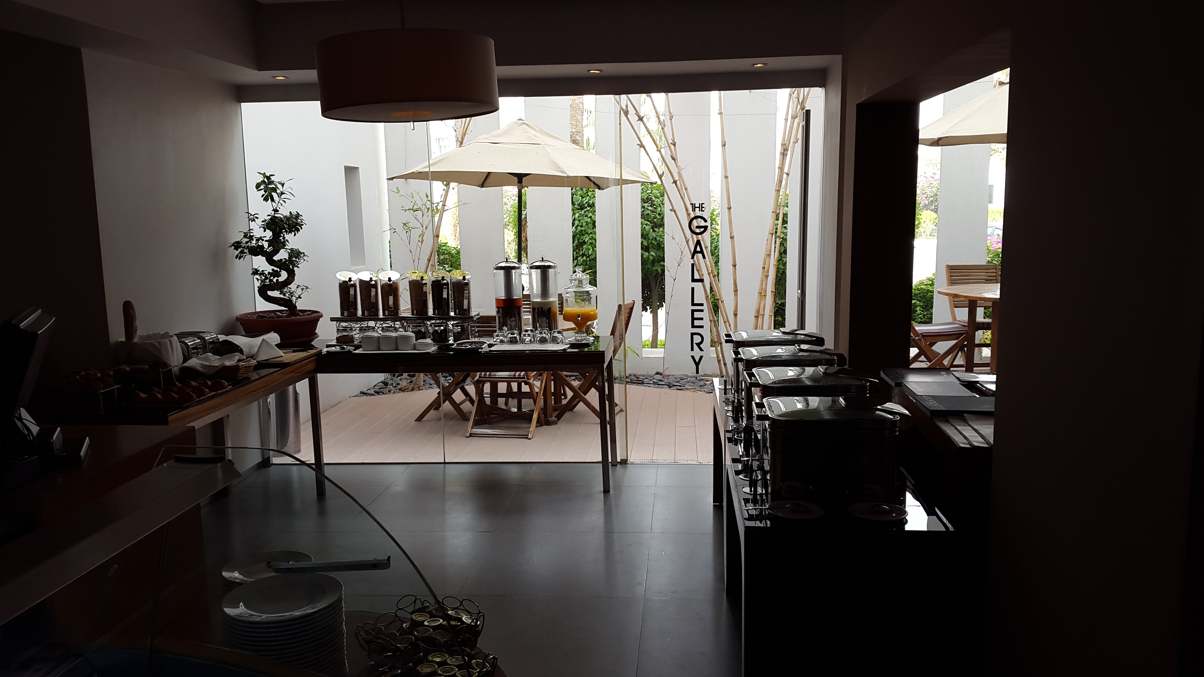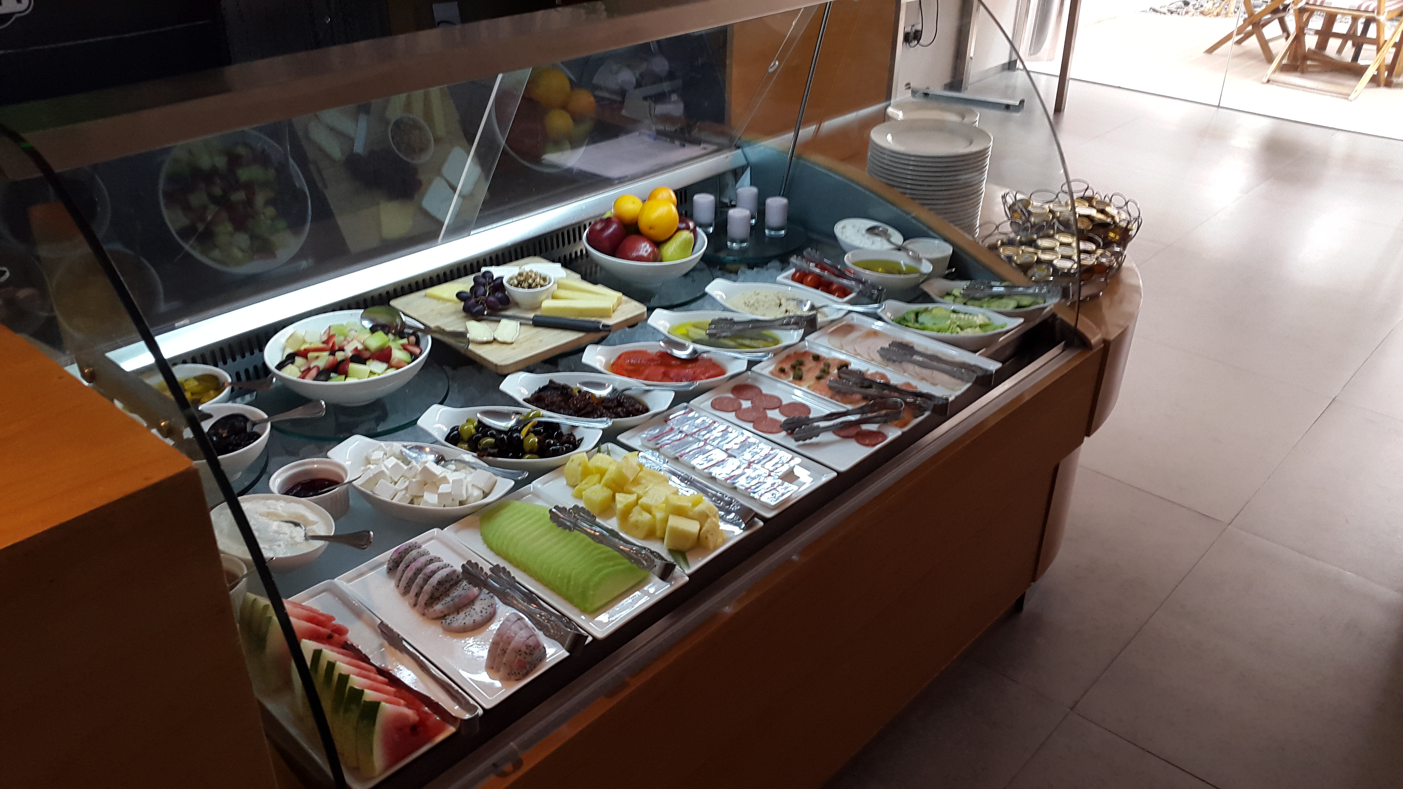 Das Frühstücksbuffet ist sehr gut ausgestattet.Es gibt frisches Obst, arabische Mezze, warme Speisen, Müsli, süßes Gebäck, Brot, Yoghurt… alles was man für einen guten Start in den Tag braucht.