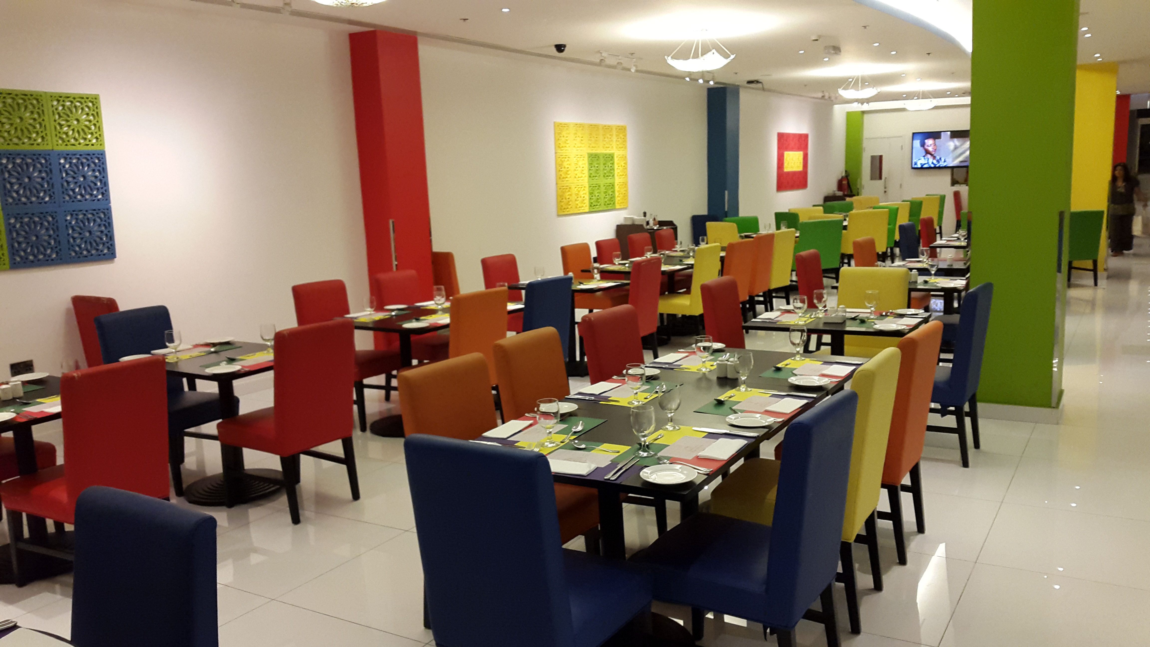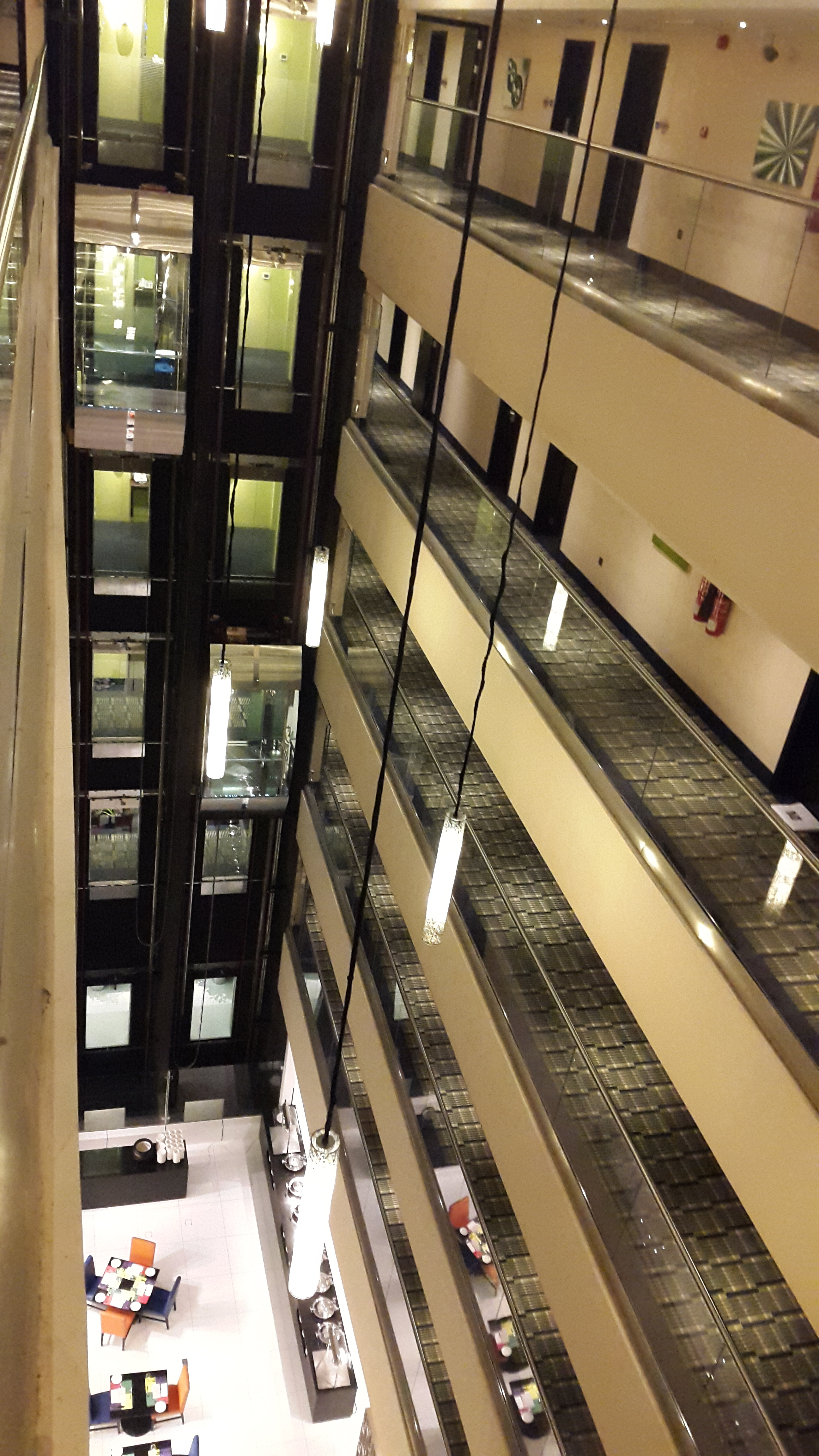 Mein Zimmer war im fünften Stockwerk und dorthin ging es mit einem gläsernen Aufzug, der einem den Blick auf den sehr bunten Frühstücksraum eröffnete.