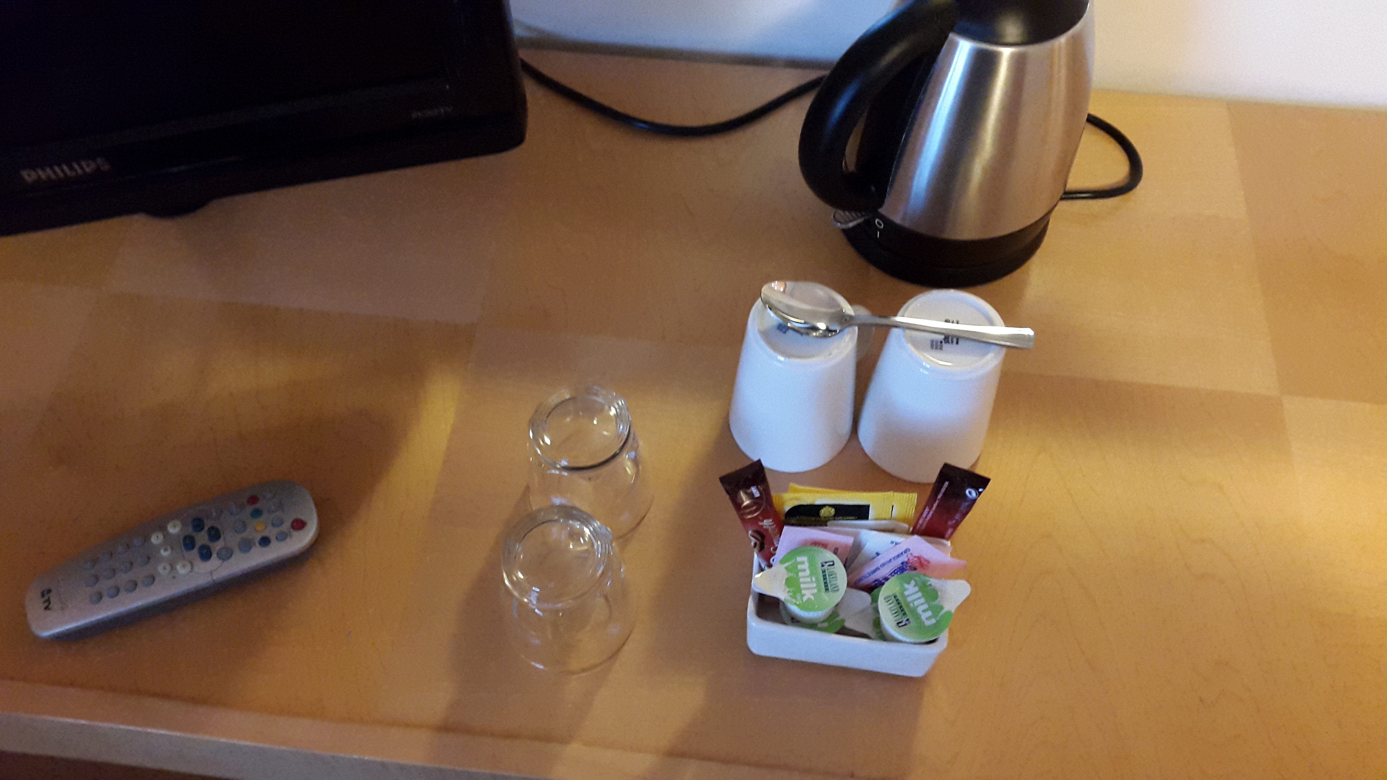 Doppel- oder Zweibettzimmer, kleines Bad mit Dusche oder Badewanne, Heißwasserzubereiter, TV und ausreichend Steckdosen und kostenloses Internet. Seife und Duschgel/Shampoo gibt es jeweils ist großen Spendern.