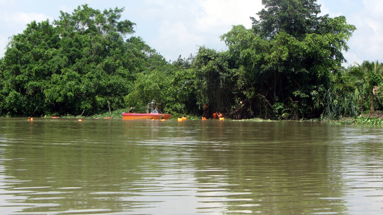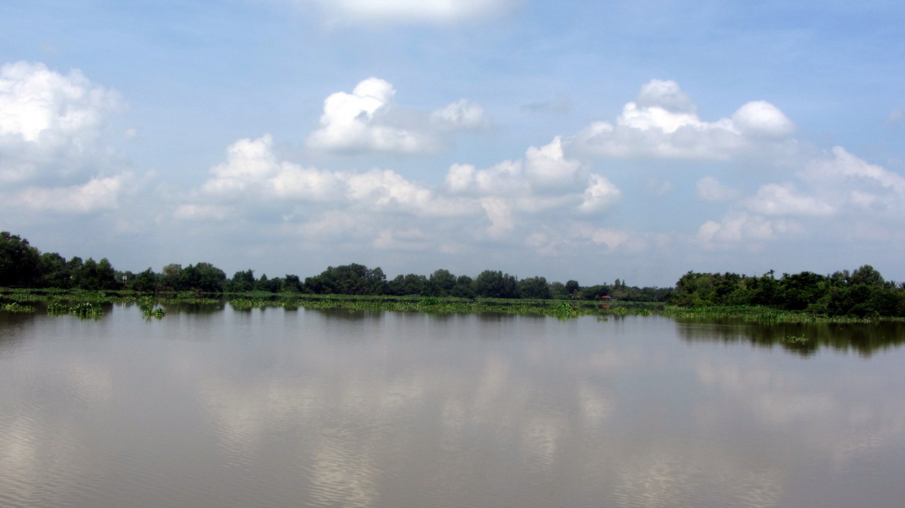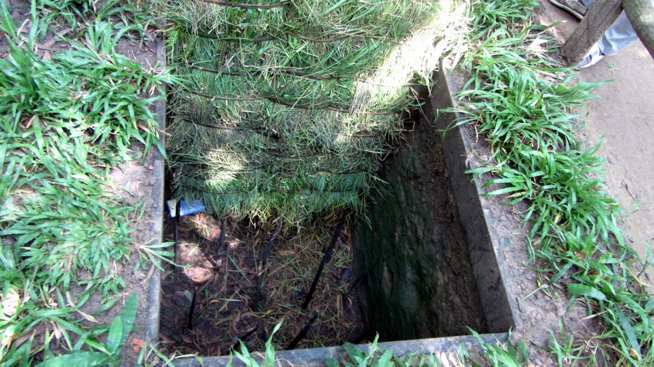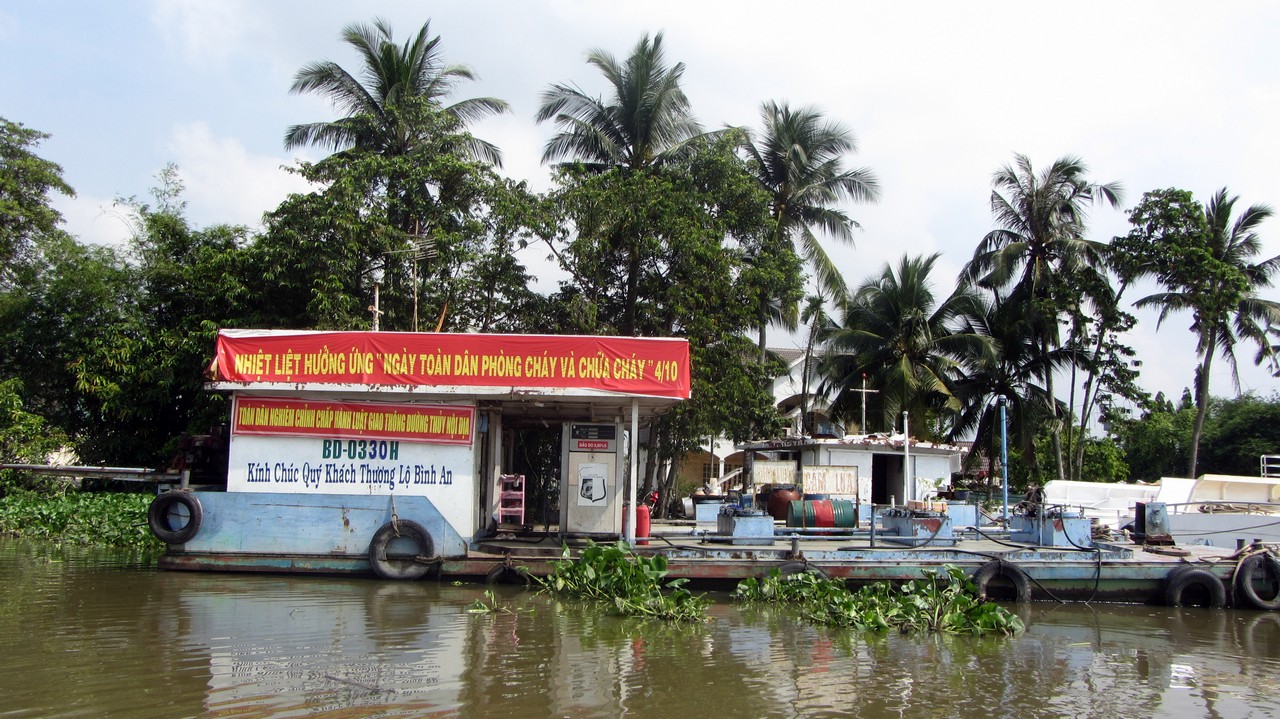 Erst säumte das Ufer die moderne Saigons, die nach und nach weniger wurde, bis irgendwann nur noch Grün und hin und wieder ein paar kleine Hütten zu sehen waren. Der Wind verschaffte Abkühlung und so schipperten wir gemütlich in Richtung Cu Chi. Hin und wieder sahen wir Fischer die ihre Netze einholten, halb versunkene Frachter, die vollkommen überladen waren und andere Einheimische. Außerdem war der Saigon voll mit Wasserlilien. Manchmal schien es, als wär kein durchkommen mehr. Zwischendurch haben wir an einer Bootstankstelle angehalten, ehe wir dann endlich angekommen sind.