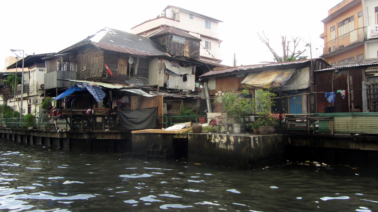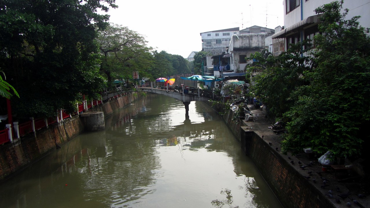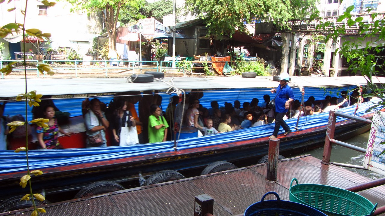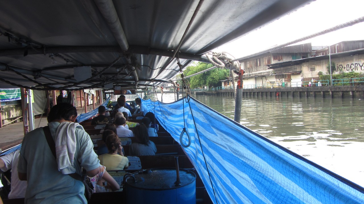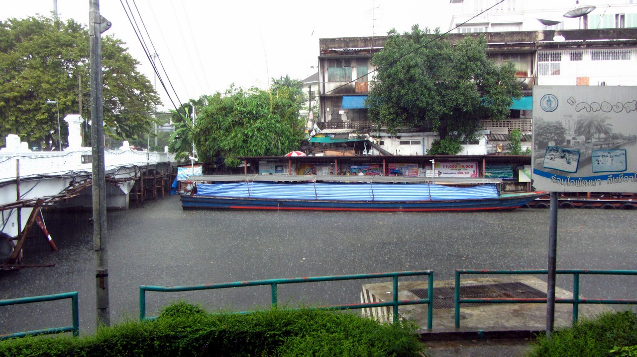 Den Vormittag hatte ich am Pool verbracht. Lesen, schwimmen und die Hitze genießen. Und Mittags, als ich loswollte, fing es an zu schütten. Mal wieder Land unter in Bangkok. Ich bin also wieder mit Schirm bewaffnet zum Spaziergang aufgebrochen. Mein erstes Ziel war die Klong-Boot Station am Golden Mount. Für 10 Baht konnte ich bis zum Jim Thomson Haus fahren, das in der Nähe vom Siam Square ist. Die Boote sind eine praktische Alternative zum Strassenverkehr, da es keine Staus gibt. Nachteil: die Klongs stinken gewaltig. Selbst Abwasser wäre ein noch zu milder Begriff. Aber die Boote düsen durch die Kanäle und das bei einem irren Wellengang. Zum Glück gibt es Plastikplanen, die einen vor dem Stinkwasser schützen. Wer fotografieren will, sollte sich am besten an den Motor stellen.