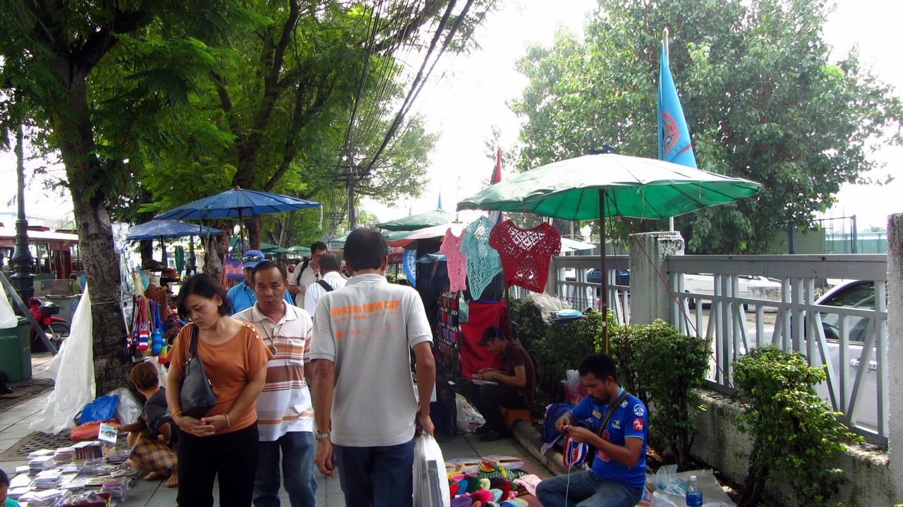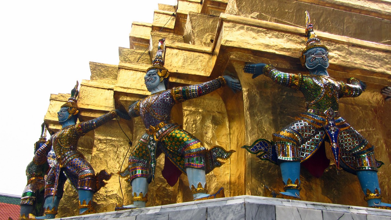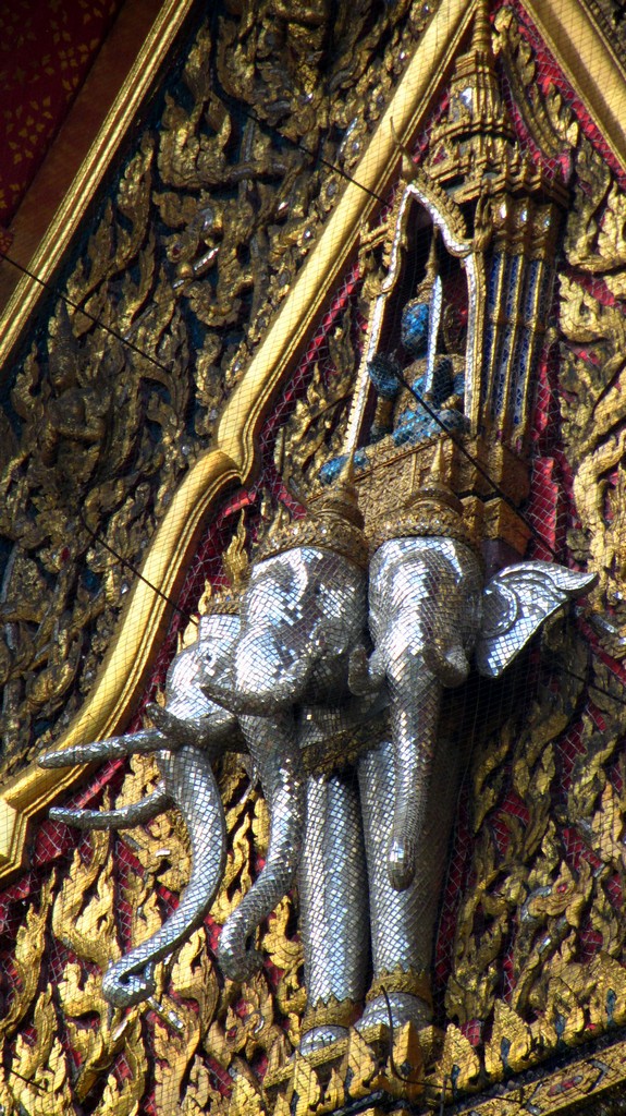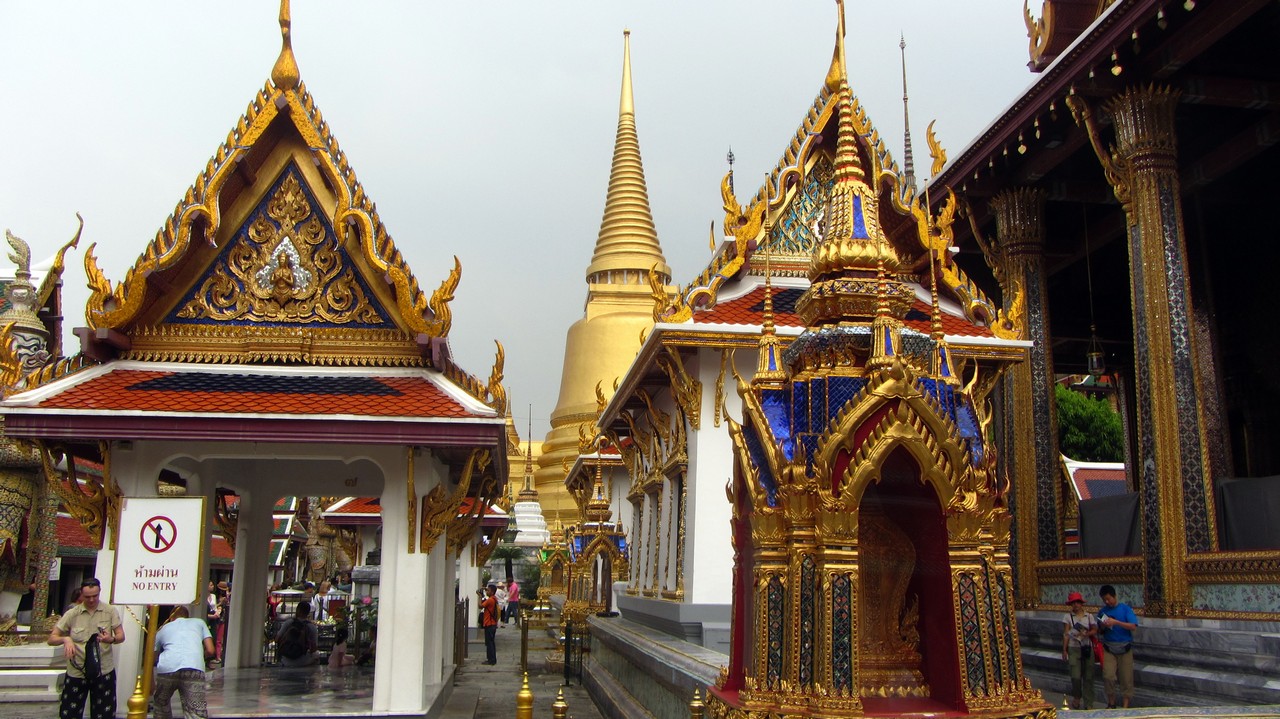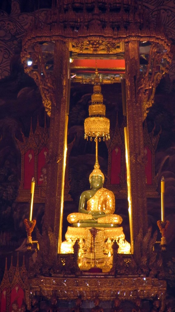 Ich bin an einem großen Flohmarkt vorbei gekommen, auf dem es nun wirklich alles erdenkliche gab. Dann kam ich zum Lak Muang, in dem der Schutzgeist von Bangkok wohnt. Ein kleinerer, aber ganz netter Tempel. Gegenüber liegt das Gelände von Wat Kaeo und dem Grand Palace, auch gut daran zu erkennen, dass es von Reisebussen und Tuktuks umlagert ist. Drinnen ist vor dem Eingang die Hölle los. Viele sind nicht passend angezogen und werden rigoros wieder rausgeschickt. Der Eintritt kostet 400 Baht für Ausländer. Dafür kann man diese Anlage und den Vimanmek Palast weiter nördlich besichtigen.