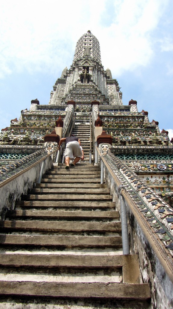 Wat Arun ist ein sehr hoher Tempel (knapp 80m) mit unglaublich steilen, fast senkrechten Treppen. Aber von oben hat man einen tollen Ausblick auf Fluss und Stadt. Der Mittlere und die vier seitlichen Türme sind reich mit Mosaiken verziert. Ein Ausflug hier her lohnt sich!