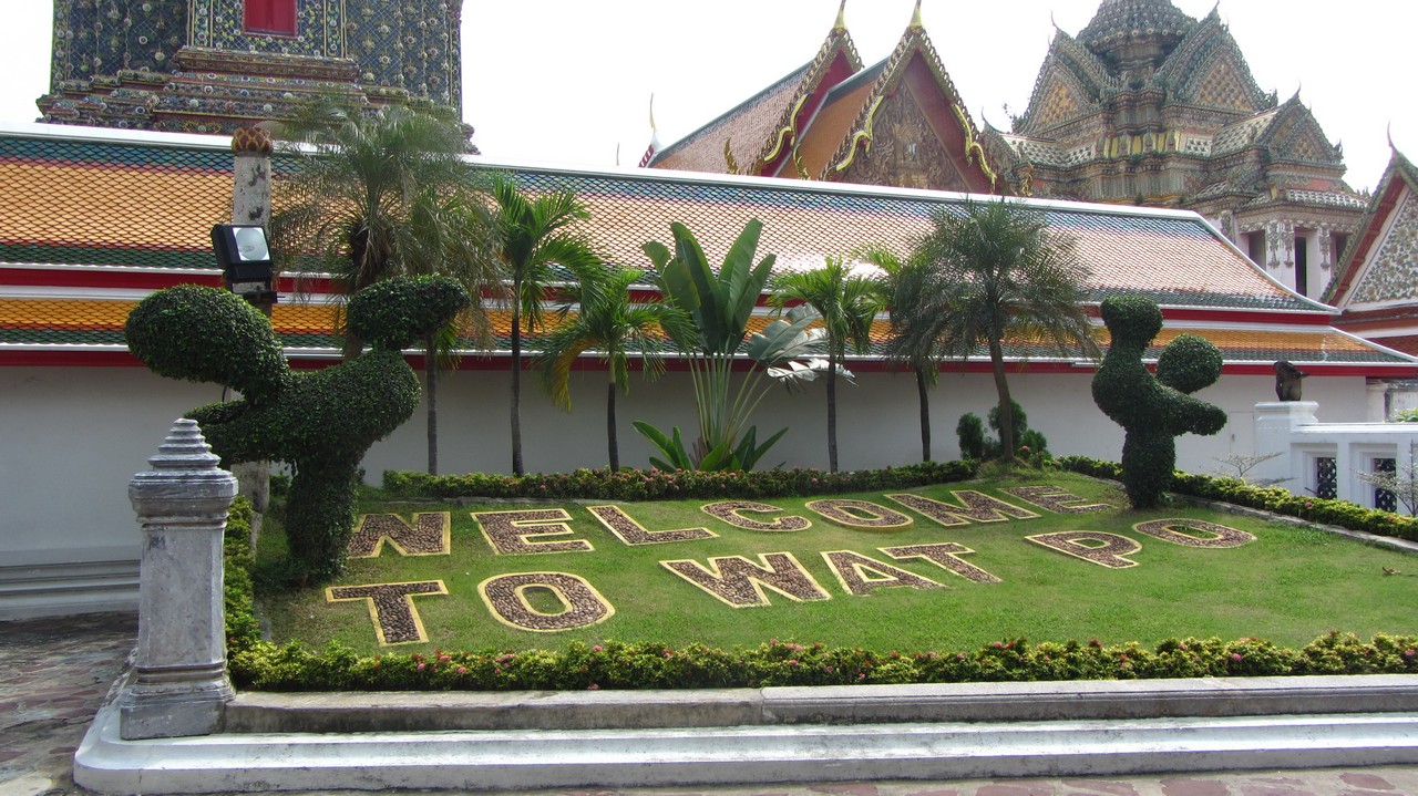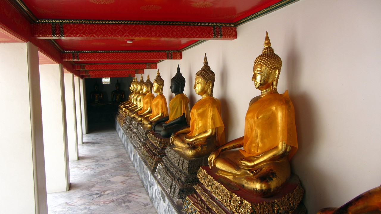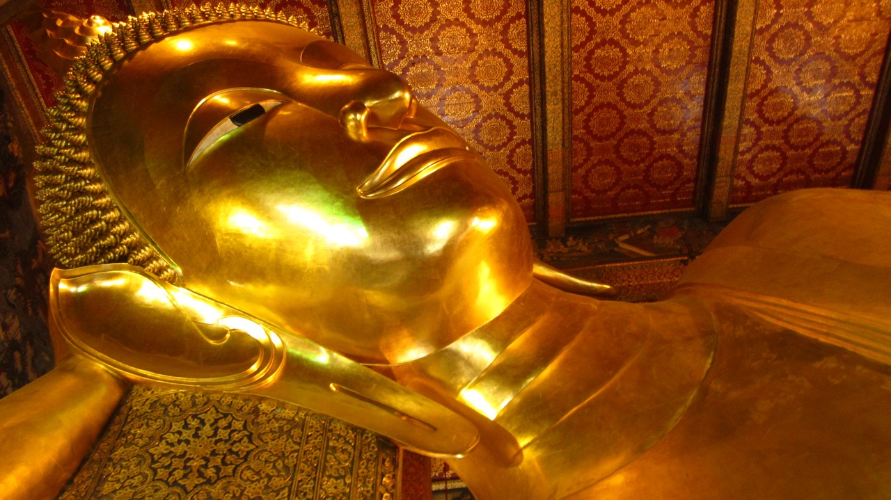 Wieder mit der Fähre zurück (es war inzwischen Mittag und ich fühlte mich wie die Hähnchen auf den Grills der Garküchen) bin ich zu Wat Pho gegangen. Für 100 Baht Eintritt bekommt man auch eine Flasche Wasser, die man immer wieder auffüllen kann. In Wat Pho ist der weltberühmte liegende Buddha. 46m lang, 15m hoch und komplett mit Gold überzogen- gigantisch! Aber auch hier ist das gesamte Gelände interessant. Hinter jeder Tür verbirgt sich wieder ein anderer schöner Hof mit hunderten goldener Buddhas, Statuen, Brunnen und Pagoden. Besonders schön ist das “Bot” das Hauptheiligtum, auch komplett golden.