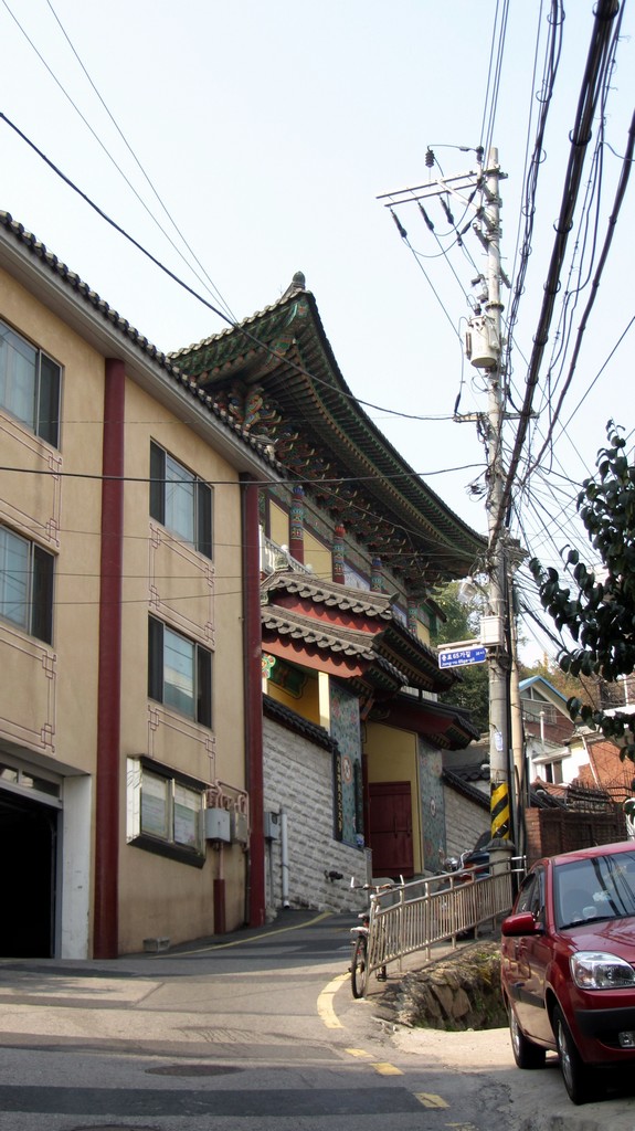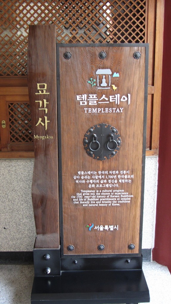 Schon vor meiner Reise hatte ich erfahren, dass man in diversen Klöstern Koreas einen „Templestay“ buchen kann (www.templestay.com). So ein Aufenthalt kann nur ein Tag, aber auch eine ganze Woche sein. Gebucht hatte ich aber keinen. So bin ich in Seoul zum Templestay Informationszentrum gegangen. Dort wurde ich umfassend über alles beraten und hatte mich dann für einen zweitages Aufenthalt im Myogaksa Tempel entschieden. Das war an sich sehr praktisch, da der Tempel in der Innenstadt liegt und nicht noch irgendwo anders hinreisen musste.