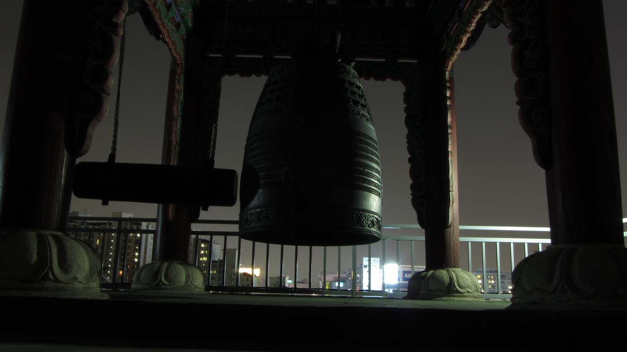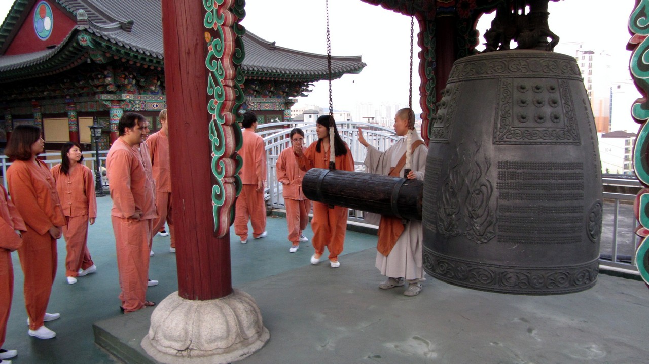 Zum Abschluss des Tages gab es leckeres Essen – bei dem nicht gesprochen werden darf – und bevor wir schlafen gegangen sind, wurde die große Glocke geschlagen. Dabei hatten wir einen schönen Blick auf die Stadt. Die Betten waren, sehr typisch für Korea, dünne Matratzen auf einem beheiztem Fußboden. Ein Schlafsaal für die Männer und eine für die Frauen.